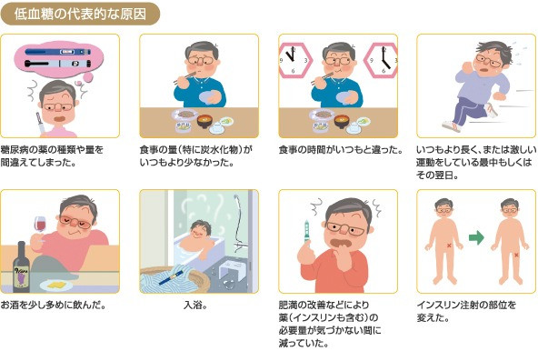 低血糖はいつ、どこで起こるかわからないので、ブドウ糖をつねに携帯しておくことが大切です。家族や周りのひとにも、低血糖の症状や、対処法を覚えてもらいましょう。また、危険な場所でのお仕事や、自動車の運転などでは低血糖が思わぬ事故につながるケースもありますので、低血糖を起しやすい人は、事前に血糖測定を行い、空腹時は何か糖分を含むものをとるよう習慣づけましょう。