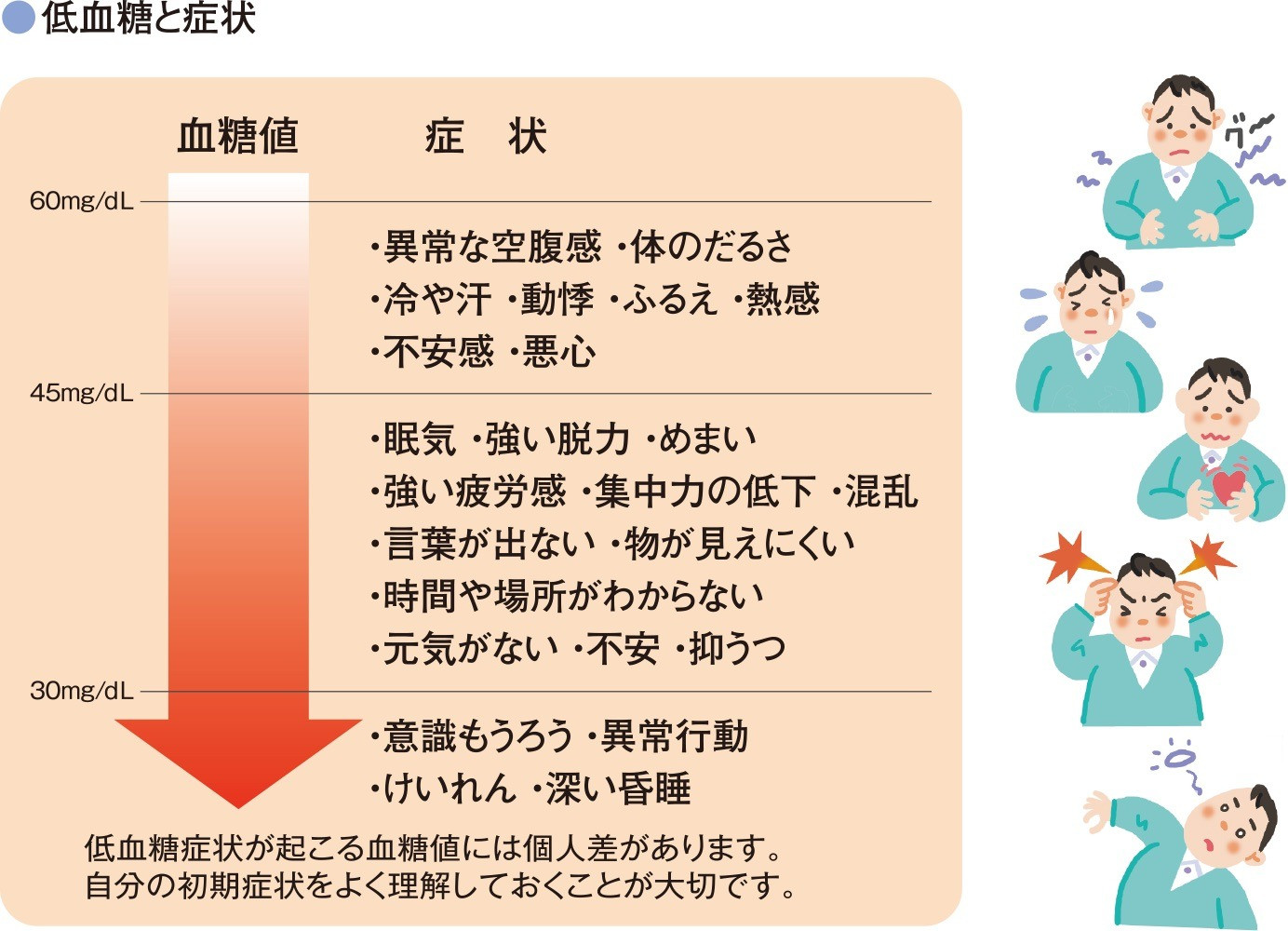 個人差はありますが、一般的には血糖値が70mg/dL以下になると症状が出現します。さらに血糖値が下がり、50㎎/dL以下になると、中枢神経にまで影響し、意識障害等の症状が出現することがあります。 低血糖は最初に症状が起きた時にきちんと対処すれば、回復します。 したがって自分の判断で薬の量を調整したり、中止したりしないようにしましょう。